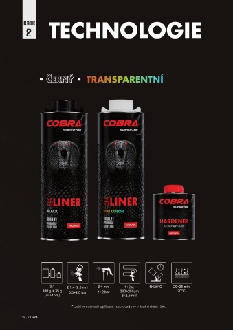 KROK TECHNOLOGIE 2 ČERNÝ • ČERNÝ • 3:1 Ø1.4÷2.5 mm Ø4 mm 1÷2 x, 1h/20°C 20÷25 min 100 g + 35 g 0.5÷2.0 bar 1÷2 bar 200÷250μm 20°C (+0÷15%) 2÷2,5 m²/l *Další množnosti aplikace jsou uvedeny v technickém listu. 38 / COBRA
